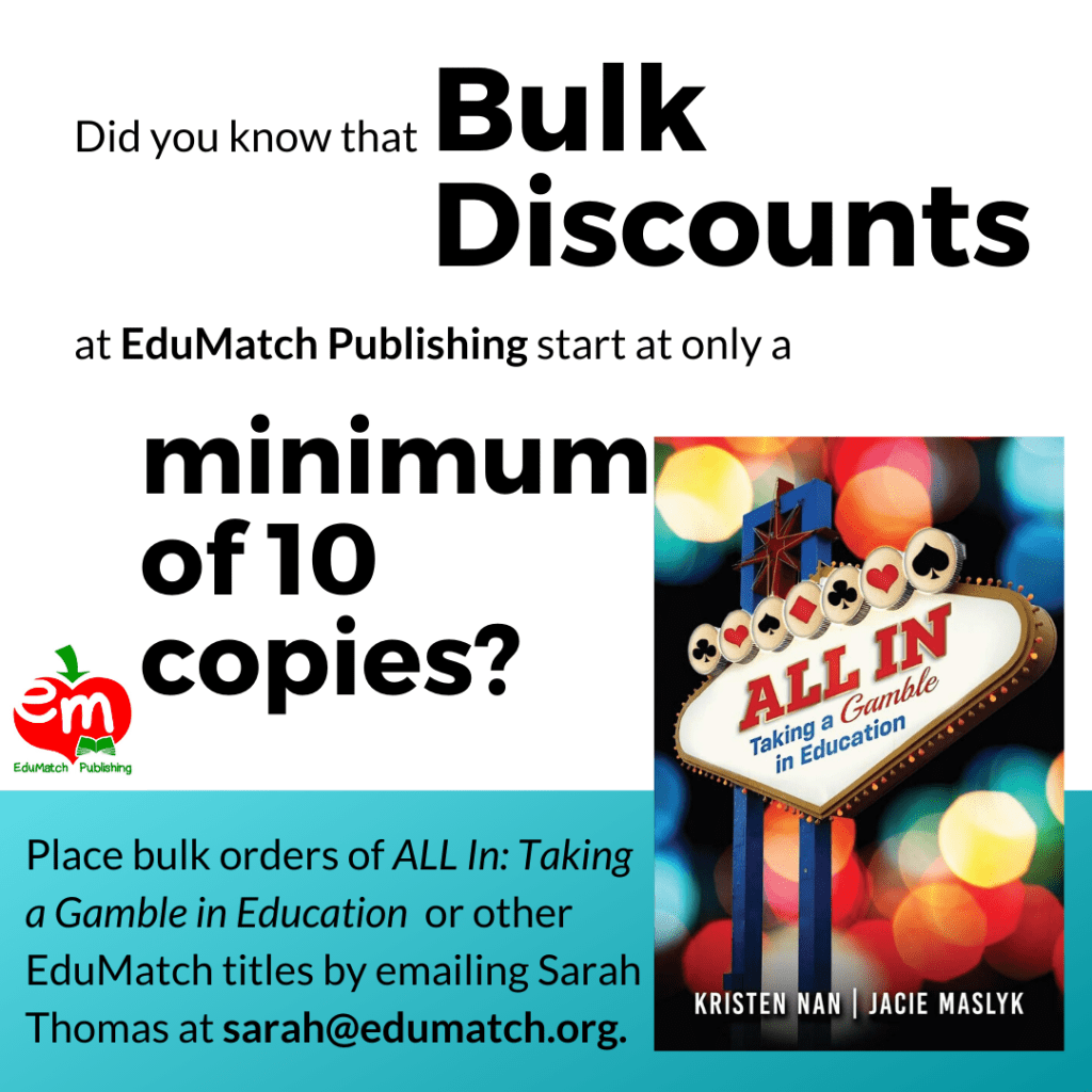 ‘All In’ has a unique voice that addresses many issues in education that deserve further discussion. By virtual fact that it is written in collaboration between a teacher and an assistant superintendent, it challenges us all to rethink and dream big when it comes to collaboration, creativity and change. The stories are filled with vulnerability, passion and honesty. The “ante ups” offer an incredible list of educators who continue to go ‘all in’ and who will inspire you with their stories. Thank you Jacie and Kristen for taking this gamble in sharing your stories with us and encouraging us to take risks, invest in ourselves and be brave enough to go ‘All In’.
