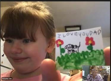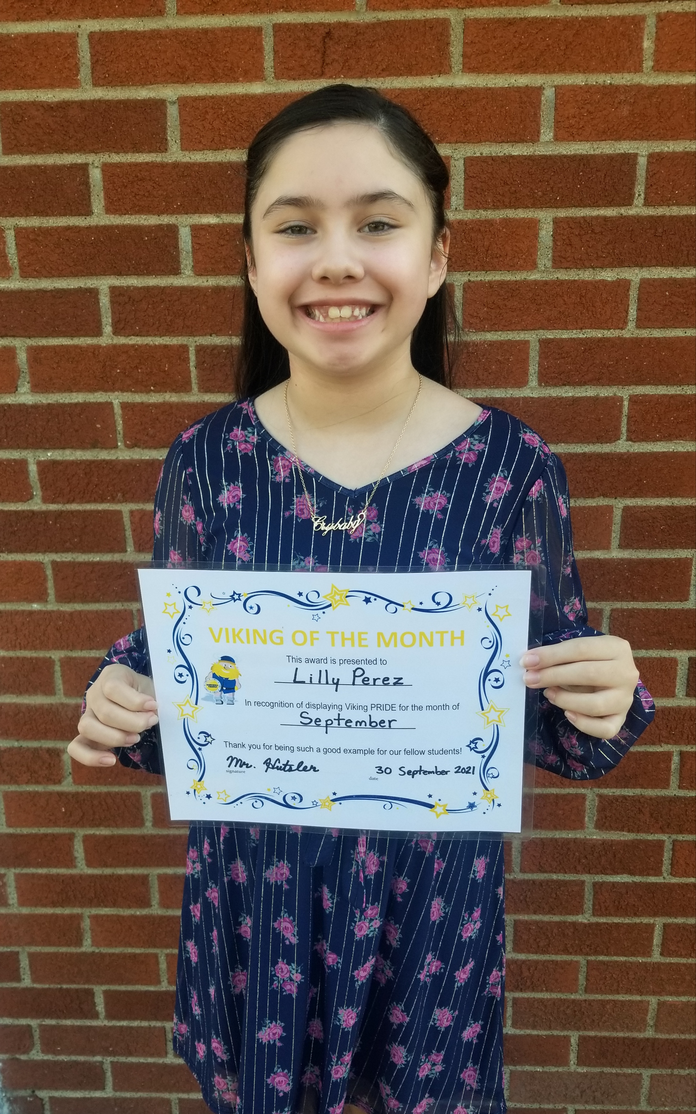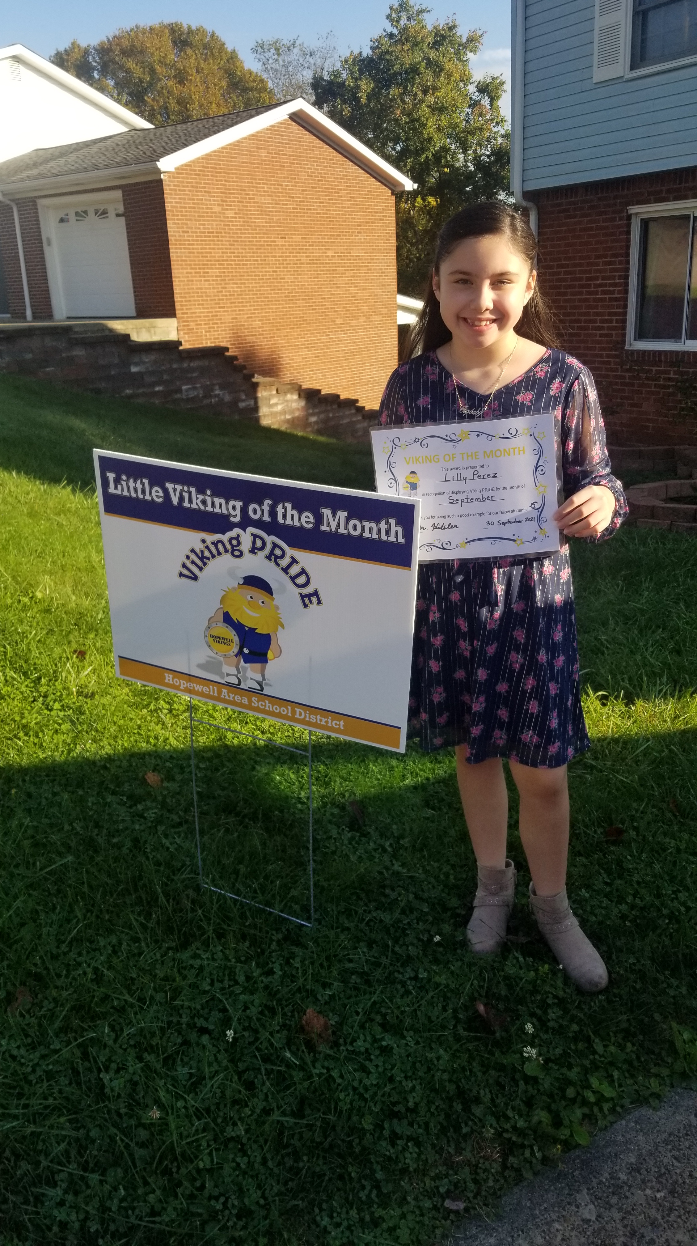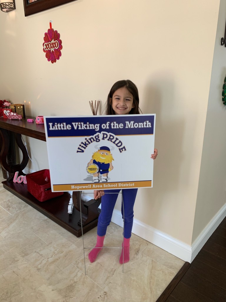 Lilly Perez was caught showing her Viking Pride this month! Lilly shows her positivity each day as she logs into Microsoft Teams with a warm hello, crushes her coursework with a smile, and engages in weekly meetings to read her favorite books and collaborate on writing. Lilly’s positivity shines bright in these pictures that were taken as Mr. Hutsler, HASD K-6 Cyber Administrator, delivered the exciting news! Way to go, Lilly!