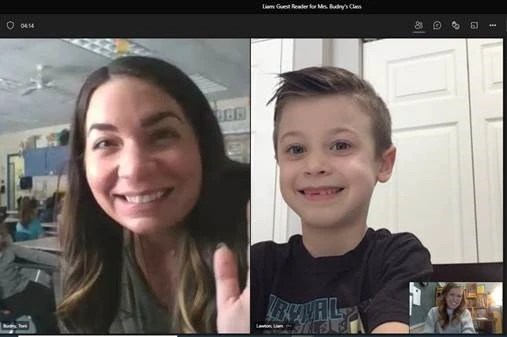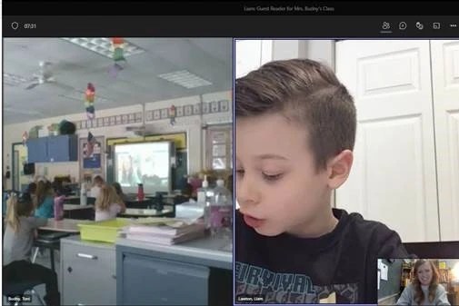 Liam, a first-grader, was a guest reader for Mrs. Budny’s Kindergarten class today. It was such an incredible experience to have a virtual visit with his former teacher to share his love for reading!