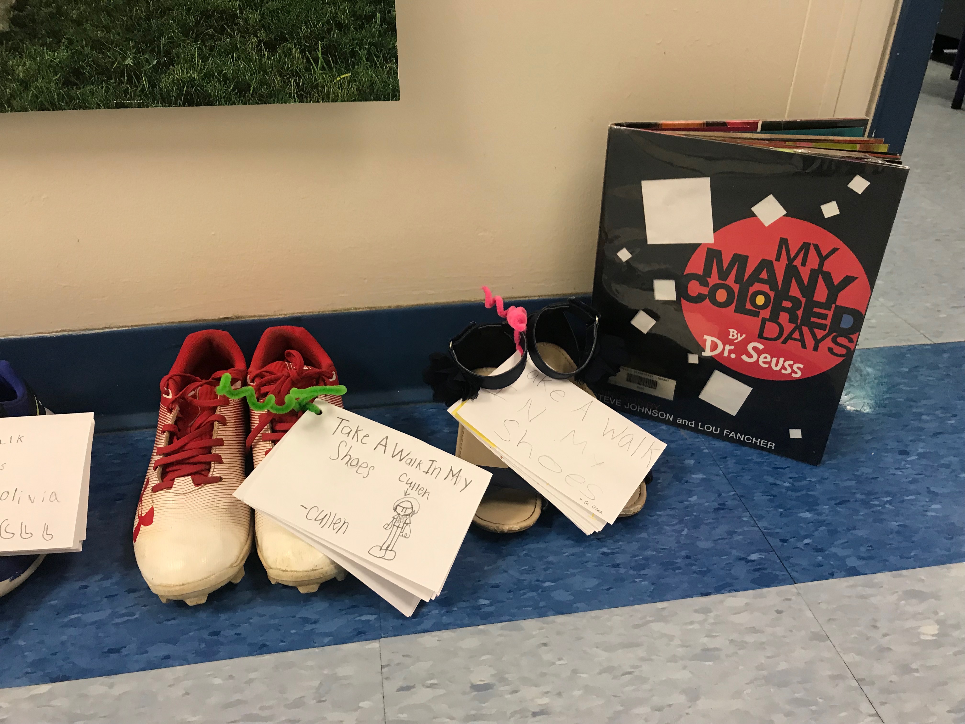 During this time, they pick out a special color pipe-cleaner to attach their cards to their shoes and then they are encouraged to pick just one they would like to share with me. After they share with me, I allow the to share with others if they would like. We then gather around and talk about our walk in life… our journey. I prompt them with questions and we take time to listen to how others feel. After many prompts, such as “Do you think others understand what you need on your black day?” or “How can you make someone else feel if you share your yellow day with them?”, I take suggestions on how we can lead others in empathy. There is always a student that suggests placing our shoes in the hallway and that is a moment for me. A moment of trust, love, and leadership. I make sure that they have the option of leaving theirs in the room, but one by one they always take their shoes to the hallway. Such vulnerability, strength, and courage found right there that moment. Come along, take a walk in our shoes.